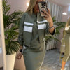 VERTIKALE SEITENSTREIFEN – Das Kleid wird durch vertikale Streifen an den Seiten akzentuiert, die die Silhouette subtil verlängern und für einen eleganten Look sorgen. Dieses Detail sorgt nicht nur für visuelle Spannung, sondern betont auch die natürlichen Linien des Körpers. Das Streifendesign harmoniert mit der farblich abgestimmten Jacke, sodass die beiden Kleidungsstücke ein zusammenhängendes und stilvolles Ganzes bilden.